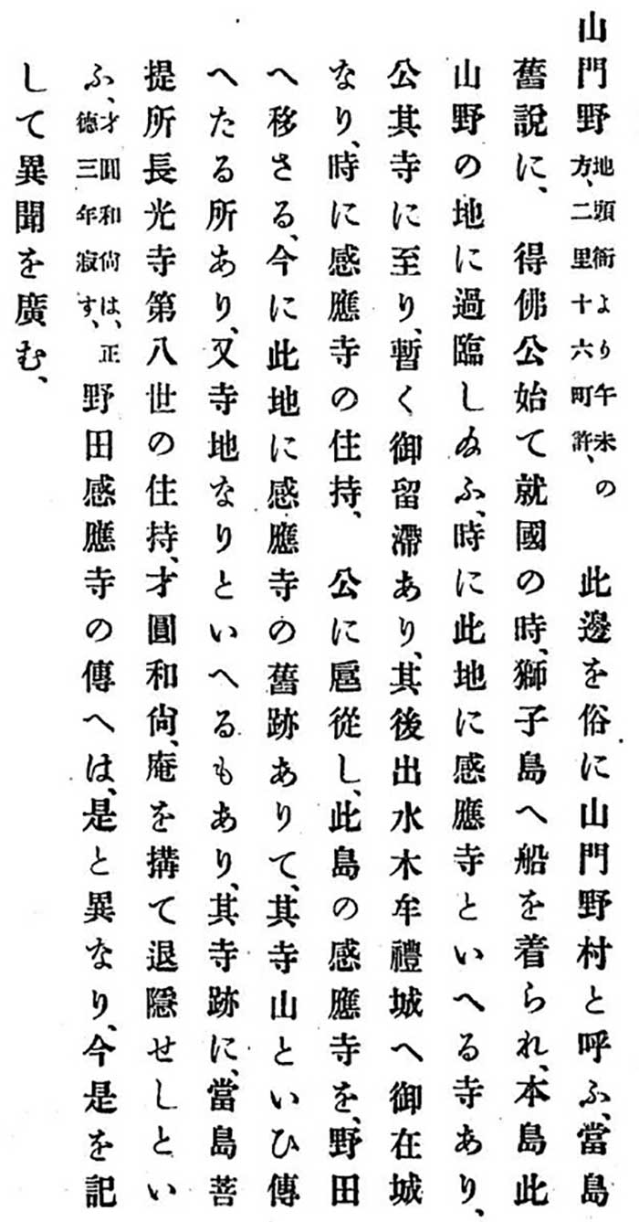 (地頭館-野田の地頭館-より北西2里16町ほど)。この辺りを俗に山門野村と呼ぶ。この島(長島)の古い記録に得佛公(島津忠久)が初めて国に入る時、獅子島に船を着け、それからこの島の