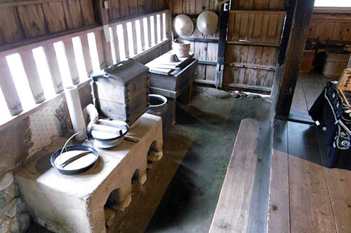 台所 公開された時再現された台所です。右の板の間は元々は土間で農作業なども行われていました。